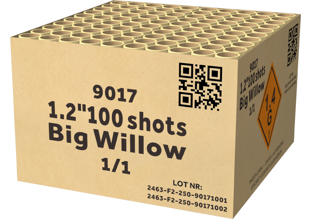 100 schoten, maximaal kaliber en 2KG kruit! In hoge snelheid worden gekleurde willow effecten de lucht in geschoten, een échte powerbak!