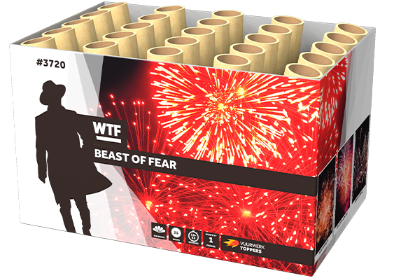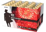 Wat een beest is deze waaiercake, de Beast of Fear! 25 schoten worden in een rap tempo de lucht in gelanceerd. Een witte strobe staart naar rode en paars peony’s