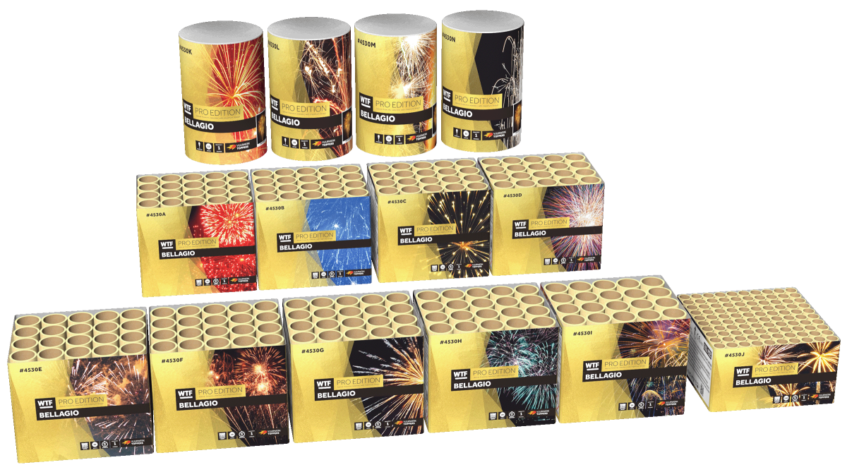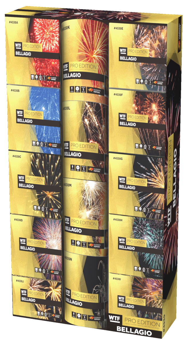 Nog zo'n gaaf pakket! De Bellagio! Groot, groter, grootst! Met maar liefst 9 cakes van 20 schoten per stuk, heb je al 180 schoten en dat is nog niet alles, de 4 spectaculaire fonteinen en een 100 schots fluitende missile cake, zorgen ervoor dat je in totaal 288 super krachtige schoten hebt! De cakes hebben verbazingwekkende effecten, de fonteinen zorgen voor prachtige glitter en de fluiters zullen ieders aandacht trekken. Hier ben je wel even mee bezig! Geniet van deze uitblinker met je hele familie!
