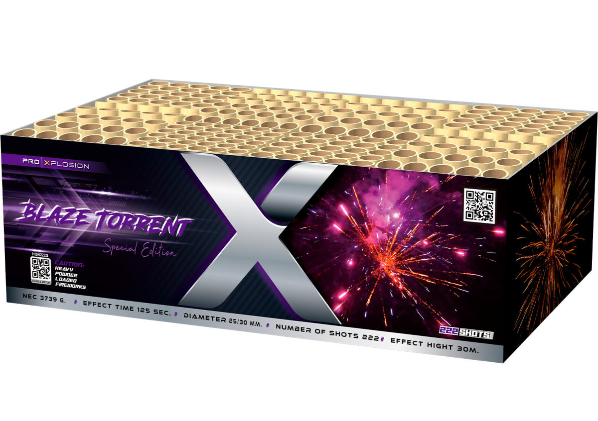 Een zware compound die blijft doorgaan. Blaze Torrent vuurt in golven, wisselt tempo en blijft verrassen met een hoge mix aan siereffecten van premium kwaliteit. 222 schoten pure showkracht en 2 KG + 2 KG kruit, dragen jouw finale. De buurt kijkt ademloos mee.