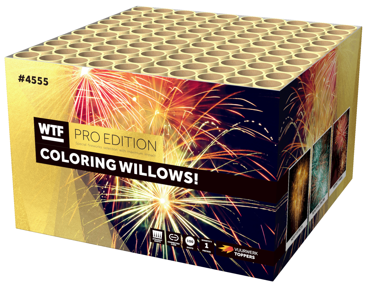 YES! 100 schoten, maximaal kaliber en 2KG kruit! In salvo’s worden felgekleurde willow effecten de lucht ingeschoten. Een échte powerbak! Een ware Pro Edition!