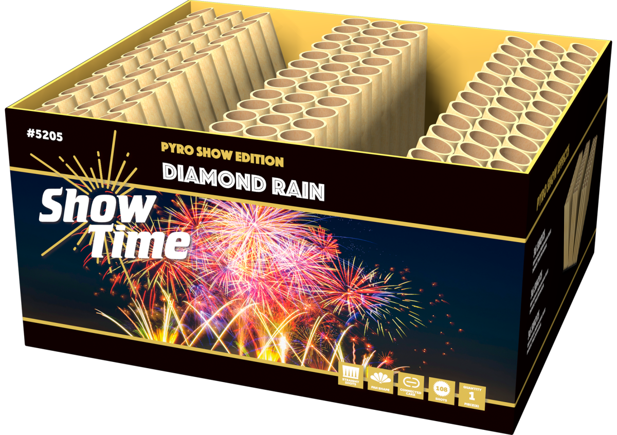 Een fantastische compound box met alle effecten in W-shape. De hele lucht wordt gevuld over een verbazingwekkende breedte! Iedere salvo bevat 12 schoten in de felste kleuren en meest bijzondere effecten. Check de video online!