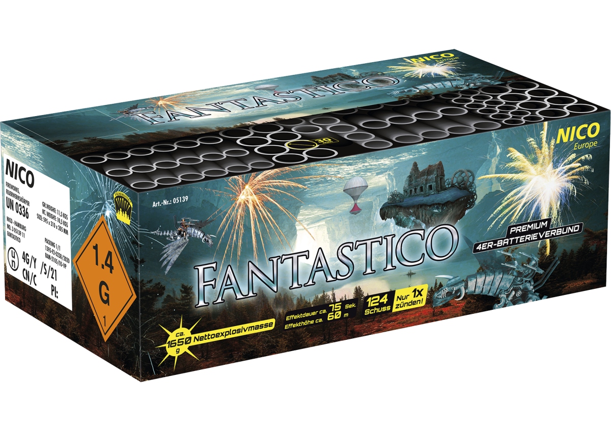 Deze ruim 1,5KG compound met 124 schoten combineert 20 en 25 mm effecten. Groen glitterende fonteinen en gouden en rode flashing comets openen in hoog tempo. Knetterende chrysanten, gouden palmen met zilveren punten en dragon eggs volgen elkaar snel op. Kleurrijke lichtsterren veranderen in zilveren chysanthemums met lange staarten.