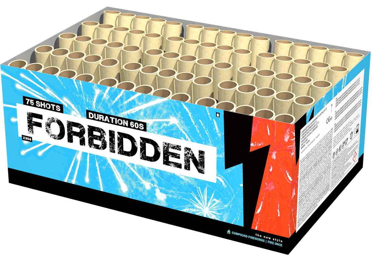 Forbidden verrast met een geheimzinnige en intrigerende 75 schots show vol purple peony, silver wave en red and blue strobe effecten. Deze cake biedt een unieke, verboden sfeer die bijna magisch aanvoelt, alsof je naar