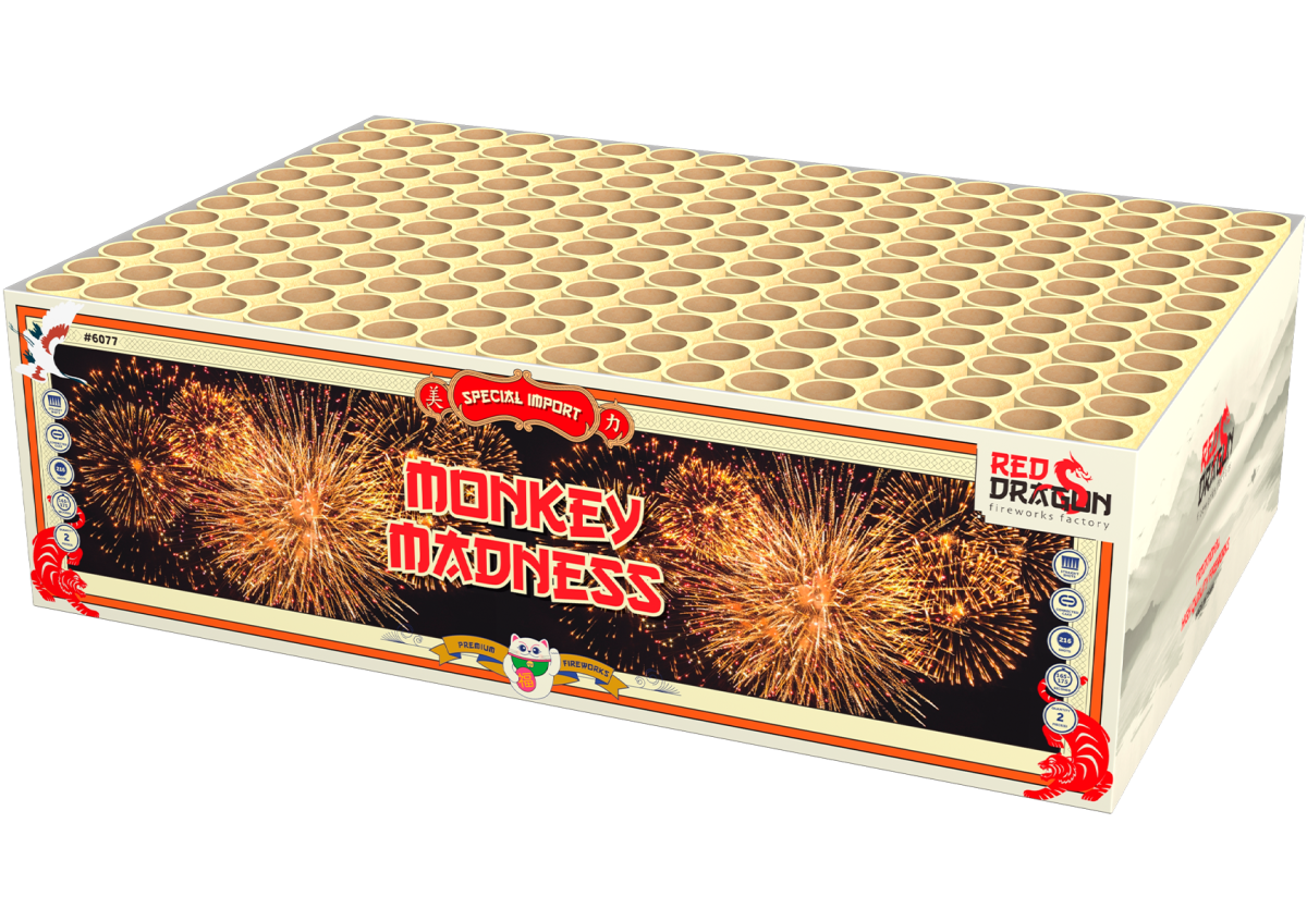 De Monkey Madness is krankzinnig met in totaal 216 schoten! Deze compound box met 1,5KG kruit beschikt over crackling, blink, palm-effecten gecombineerd met rode, groene, gouden en zilver sterren. Bijna 3 minuten spektakel in de straat en slechts 1x aansteken!