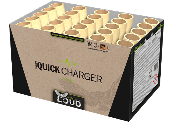 Quick Charger schiet 25 schoten in rap tempo met een waaier van kleuren, waaronder red comet tails, blue stars, en fonkelende silver crackling. Deze energieke cake laadt de lucht snel op met knallende effecten en geeft elk moment een boost. Laad de spanning op met Quick Charger!