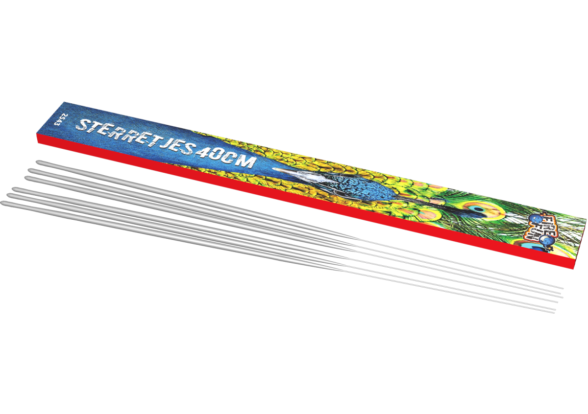 Werkelijk iedereen kent ze: de sterretjes. Ze geven felle witte vonken. Leuk om bijvoorbeeld een taart mee te versieren. Deze zijn per 5 verpakt en zijn 40 centimeter lang.