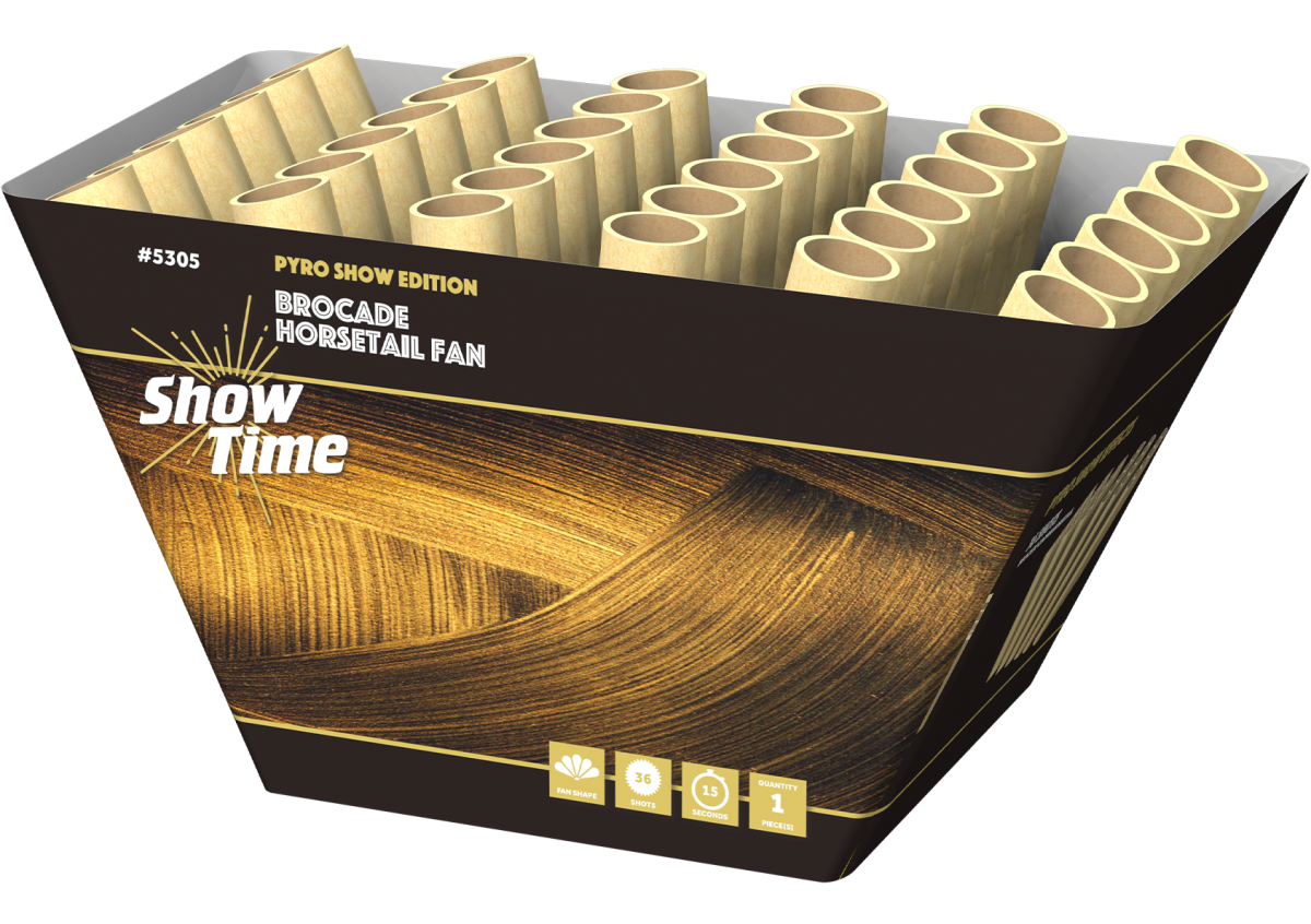 Deze fanshape cake schiet gouden brocade horsetails in strak tempo. De 36 shots, 500 GRAM, 25 mm cake, trekt lange, volle tails door de lucht en zorgen voor een krachtig goudbeeld.